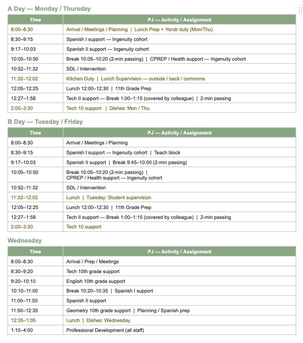 Carry non-instructional duties as assigned — including lunch supervision, kitchen/dish duty, Yondr phone collection, breakfast setup, and Student Council coverage. These are not extras. They are part of how this school runs.